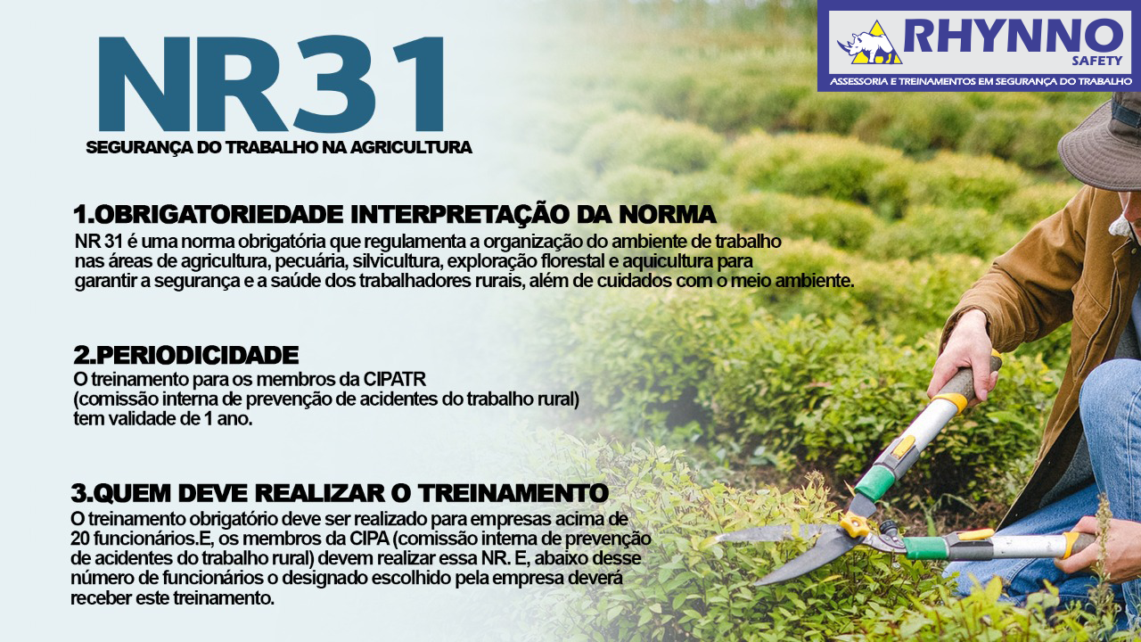 Esta Norma Regulamentadora – NR31 tem por objetivo estabelecer os preceitos a serem observados na organização e no ambiente de trabalho rural, de forma a tornar compatível o planejamento e o desenvolvimento das atividades do setor com a prevenção de acidentes e doenças relacionadas ao trabalho rural, de forma a tornar compatível o planejamento e o desenvolvimento das atividades do setor com a prevenção de acidentes e doenças relacionadas ao trabalho rural.